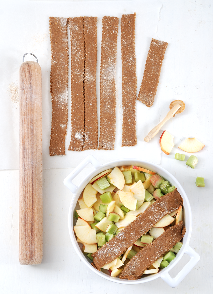 Le cobbler, c’est donc une pâte à biscuit qui, au lieu de s’émietter du bout des doigts comme un crumble, s’étale comme une pâte à tartepour venir garnir vos fruits compotés. Vous pouvez étaler cette pâte entièrement façon tourte, par petits morceaux, ou encore en jolies lanières comme ici. Cobbler is made of a sort of cookie dough that you roll out instead of sprinkling it over fruit. You can roll it out completely like you would a pie, or add separate dough pieces, or even strips as I did here.