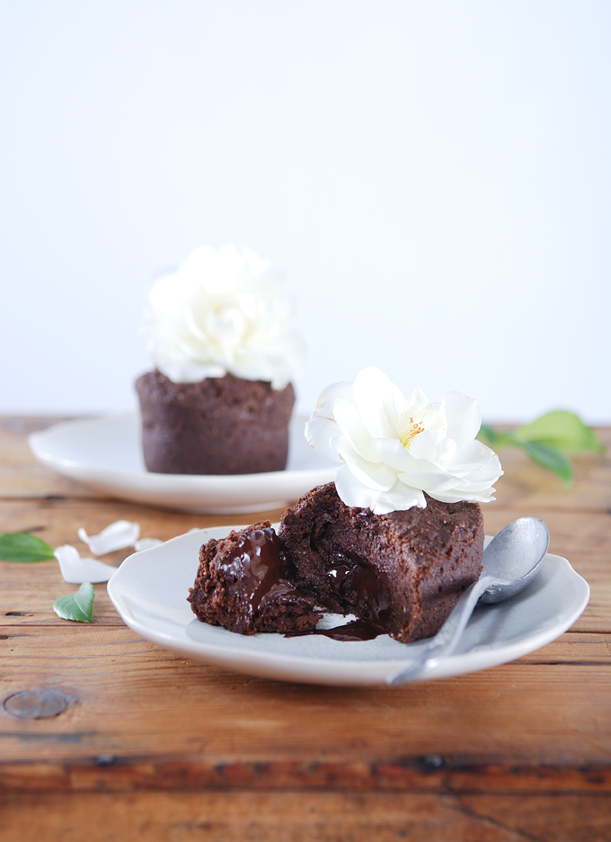 In a coffee grinder, process buckwheat flakes, coconut and chia seeds into a fine powder. Transfer into a bowl and add cacao and salt. Mix thoroughly. Add agave and water. Pour half of the mixture in 4 small silicon pans and let set in the fridge for 20 minutes. When it has thickened put one piece of chocolate on each and cover with the remaining mixture. Let set in the fridge for two hours. Gently take the cakes out of the pans and put them on a dehydrator tray lined with parchment paper. Dehydrate for 1h15 to 140°F, flipping them over gently after 45 minutes. Transfer on plates and enjoy immediately. If you don’t have a dehydrator, use chocolate spread to put inside the fondants (such as this one) and let them sit at romm temperature at least 30 minutes prior to serving.