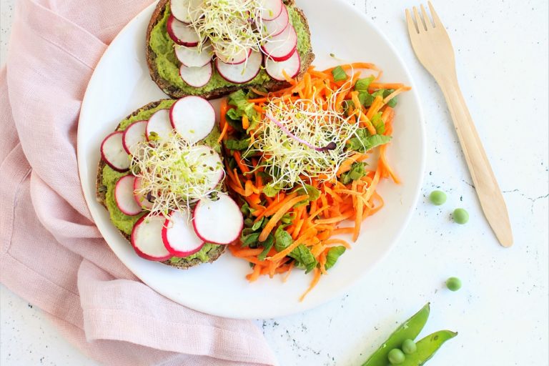Tartines au houmous de petits pois, radis et graines germées – sans gluten, sans lait, sans soja